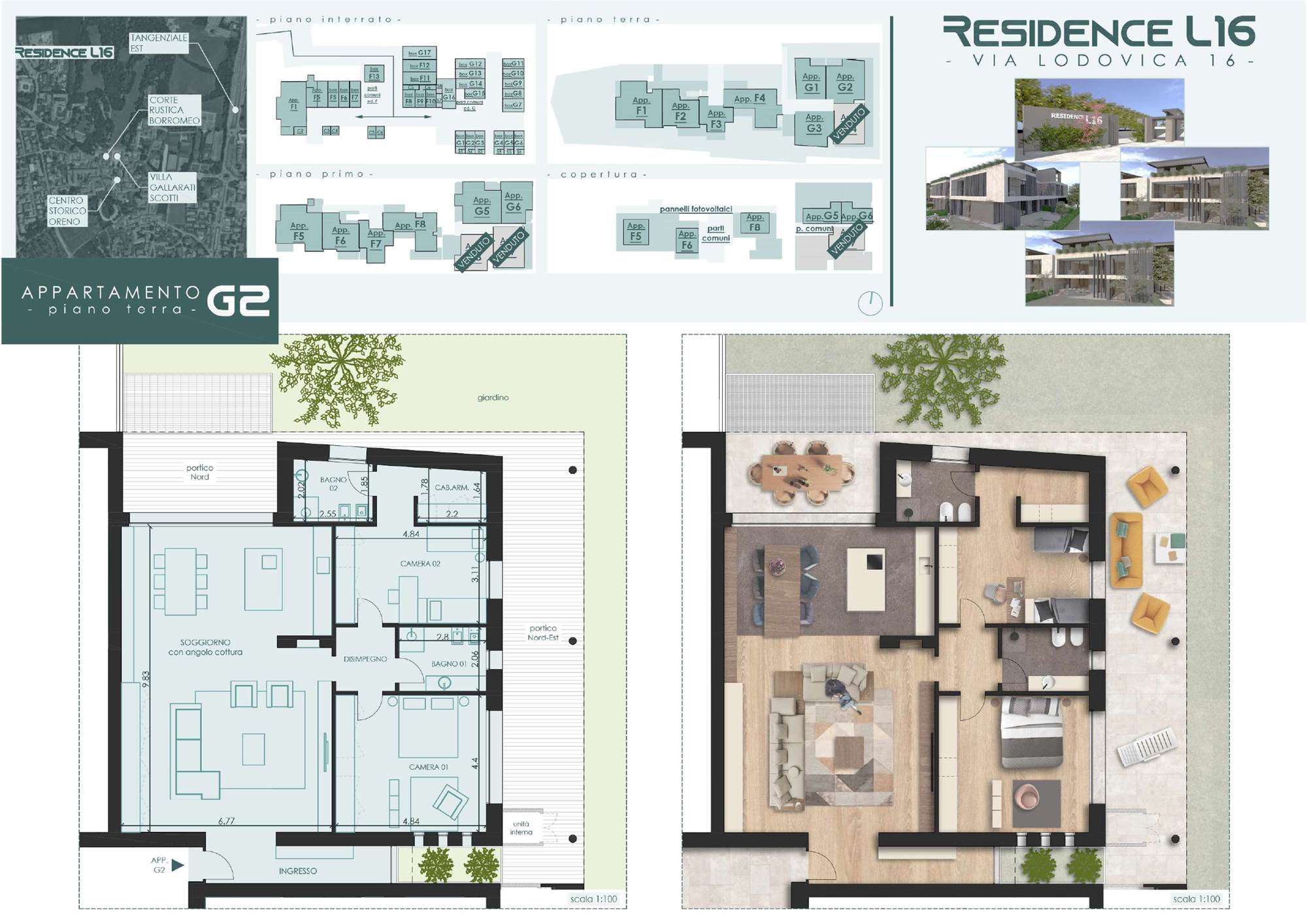 La palazzina si compone da 8 appartamenti, 4 al piano terra con giardini privati e 4 al piano primo impreziositi da logge e terrazzo sul tetto dell'edificio accessibile da scala autonoma.
